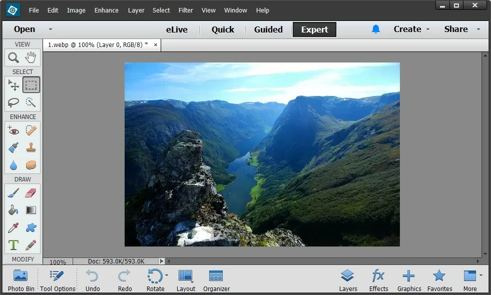 Click on that window to make it disappear again, and now you should be able to open and save WebP images in the Photoshop Elements 13 Photo Editor, like this one: