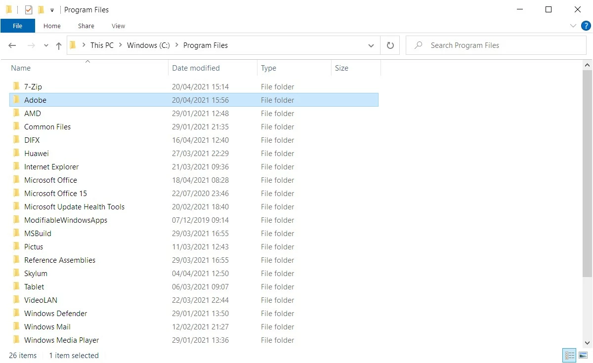First off, the fact that you have a Program Files (x86) folder on your computer means you are running a 64-bit version of Windows 10. Secondly, as you don't have an Adobe subfolder inside your Program Files (x86) folder means you are also running the 64-bit version of Photoshop Elements 13.