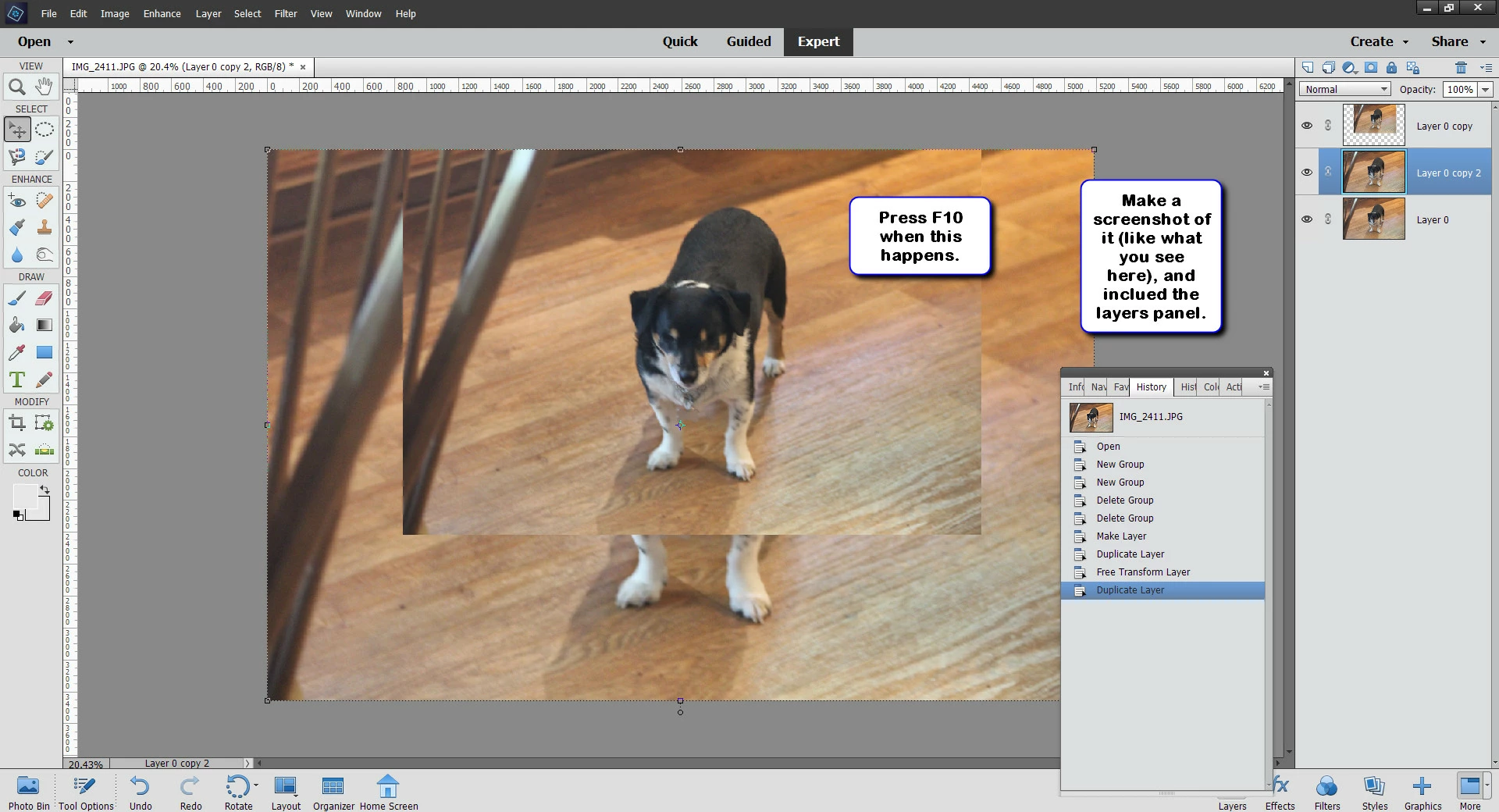 Same problem, no layers. Win 10 up to date, HP all-in one with I9. Additionally if this condition occurs and I open another file, the moving (with mouse) image is on the newly opened image.  Per another forum suggestion, I reset the tool, in fact all tools, no change.  After resetting tools, I even re-booted, no change. Started out of the blue, PSE user since version 6, quite experienced. Adobe support won't talk to me, how wonderful is that?!!