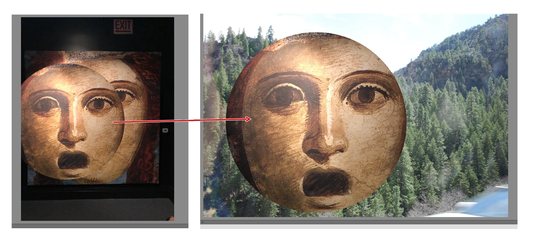 @Second Holly, you are describing what happens when you have been using the clone tool.  In the following screenshot, I have used the clone tool to alt-click on the face with a large brush, then switched to another photo.  The copied/cloned face remains in the clipboard and is available to paste in the other photo.