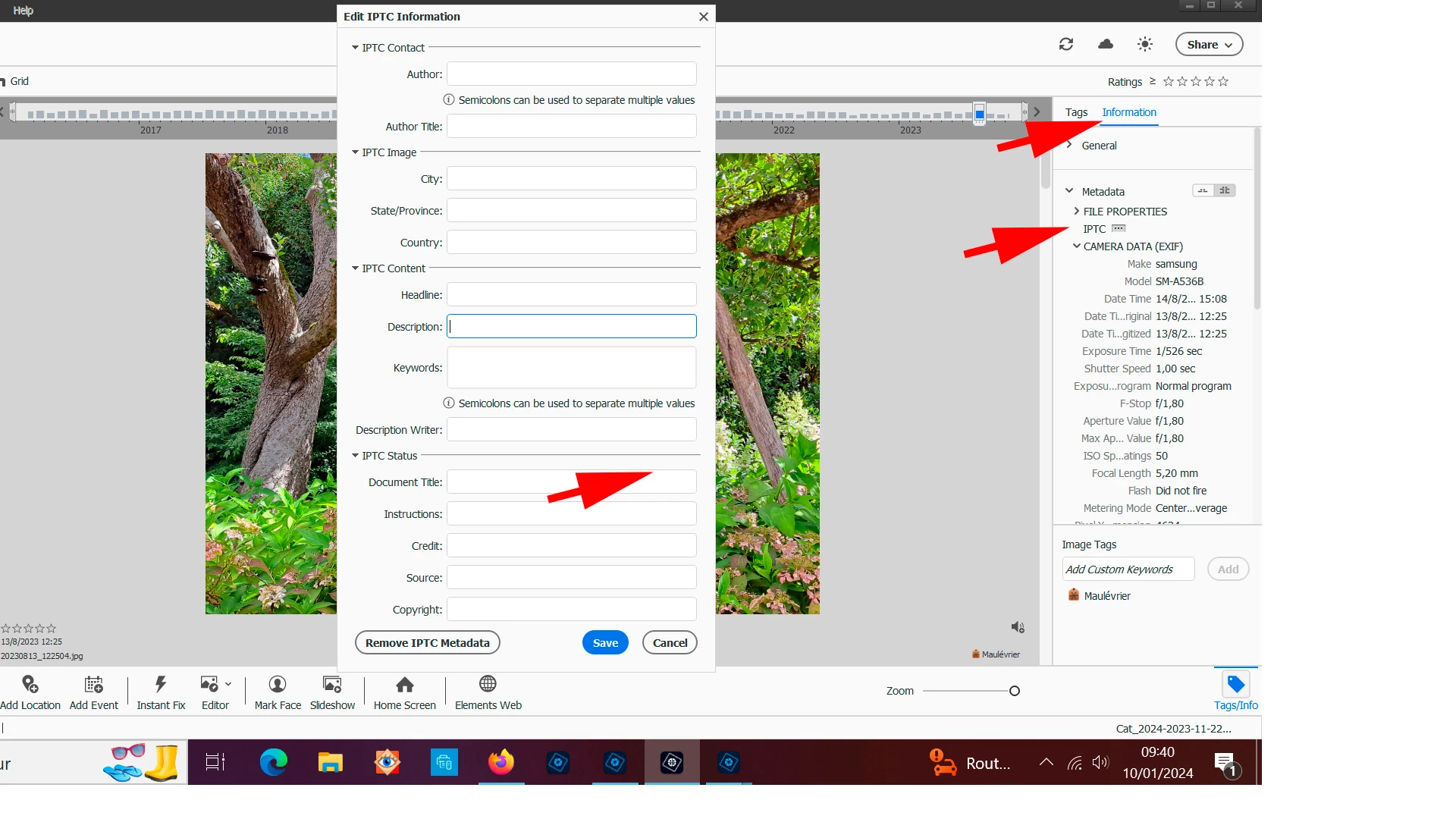 What is the Adobe jpeg EXIF tag for Description Writer