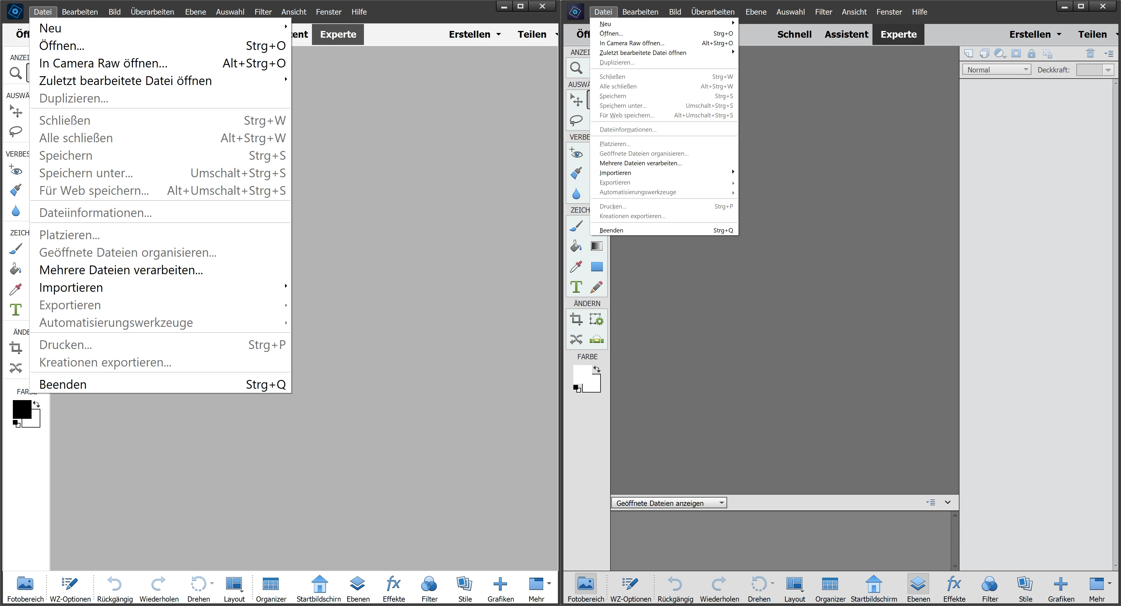 Photoshop Elements 2021 on the right side with regular font size for menu items, Photoshop Elements 2023 on the left side with far to big font size for menu items on a 4k display: