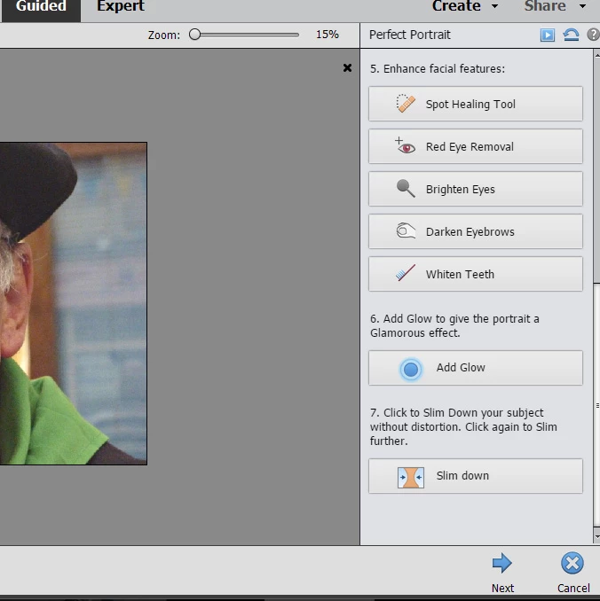 In PSE15 there is a guide effect in the 'Perfect Portrait' section with the possibiliy to 'slim down' your subject'.
