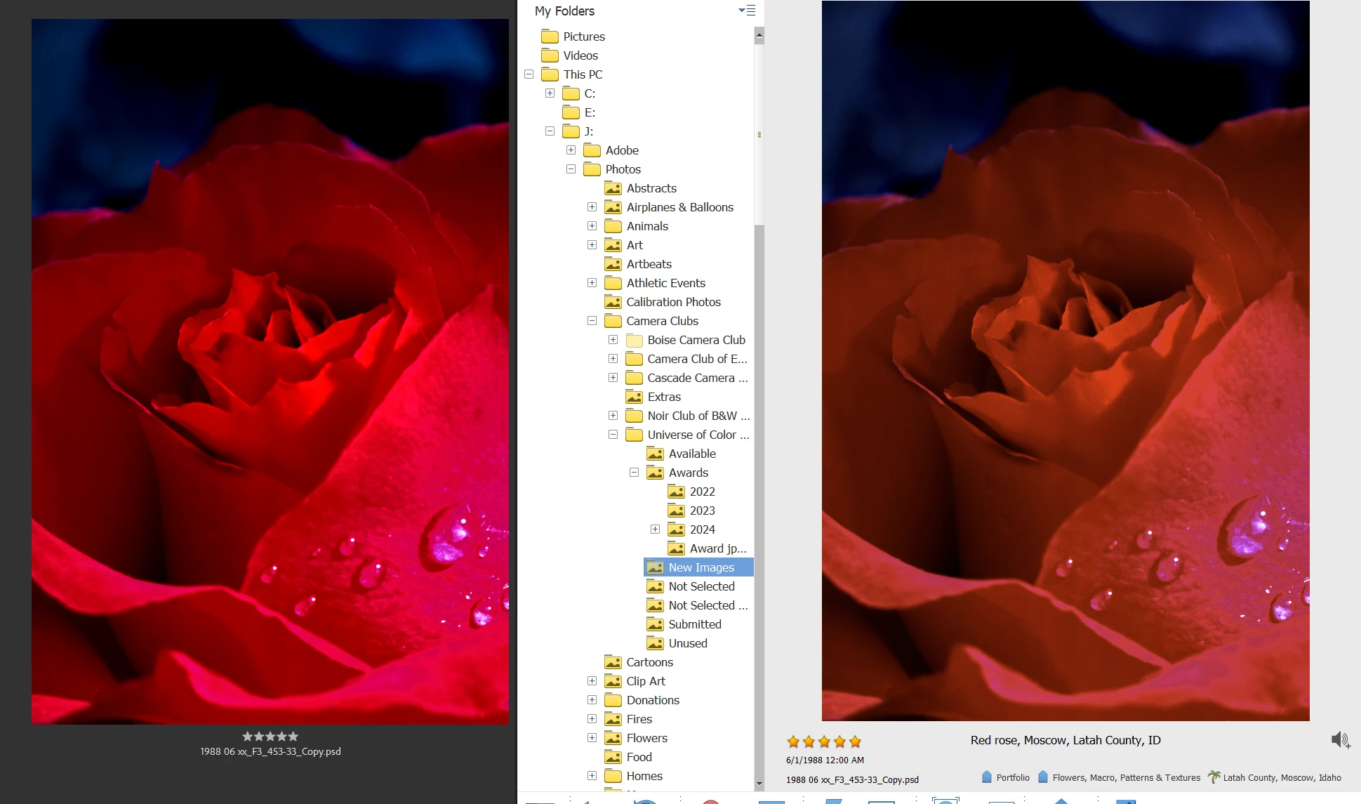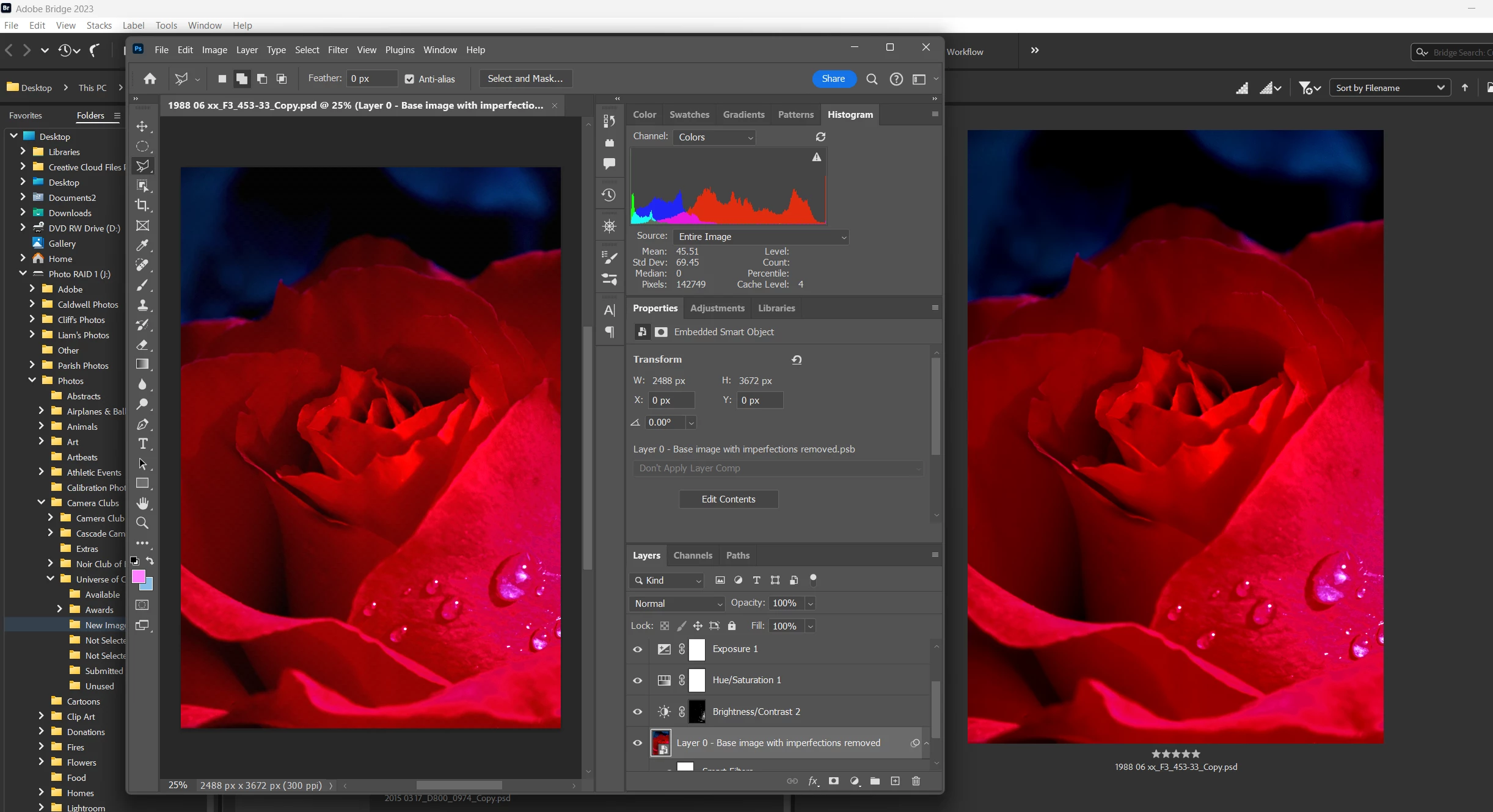 The center of the rose is somewhat brighter in Adobe Bridge(left). When the file is viewed side-by-side in Photoshop CC and Adobe Bridge they look the same as shown below:
