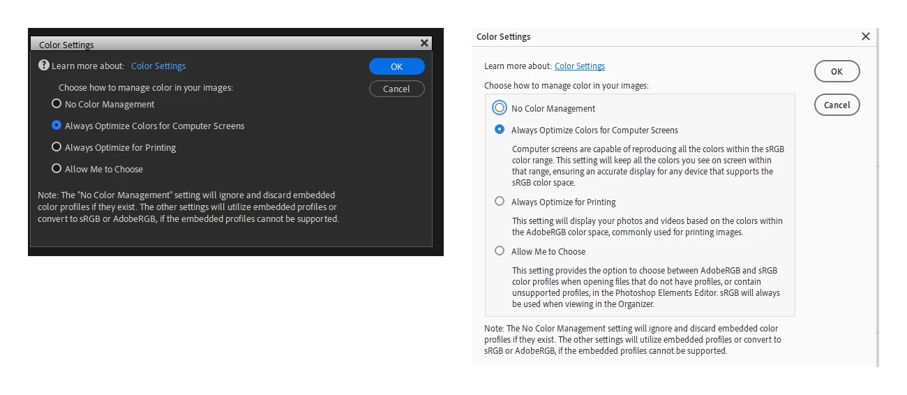 I've been wonder for some time why some of my images will look different when viewed in Adobe Bridge 2023 vs being shown in the Photoshop Elements Organizer 2022. I'm looking at them both on the same monitor, a BenQ SW 2700 driven by a NVIDIA RTS A2000 12 GB card on a Windows 11 Pro platform. The color profile is set to sRGB IEC 61966-2.1.