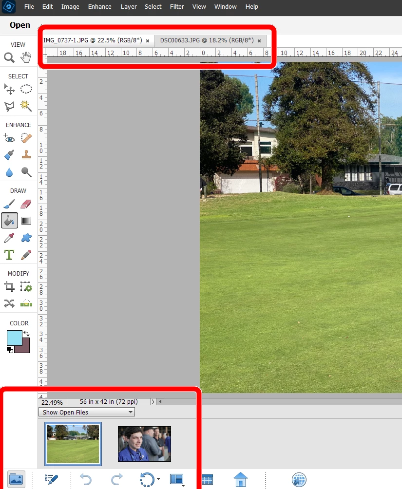However, whenever I open the second picture containing the sky I want to use (at 2:25 in the video), the first picture disappears from the main work area of Elements as well as from the two above layers in the layer panel. In the video I am following, neither the picture nor the first two layers disappear when he opens the second picture, so I am doing something wrong.