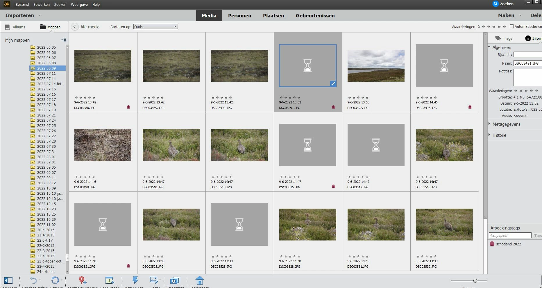 Small representation of thumbnails does not work properly. Using little thumbnails some pictures are shown correct, others only grey with a hourglass. Changing to a greater size these grey-with-hourglass change to the correct picture, but back to smaller thumbnails they change again to grey-with-hourglass. This phenomenon is attached to specific pictures (correct and hourglass-representation of the same camera, same day, same hour; see screen dumps). What tot do?