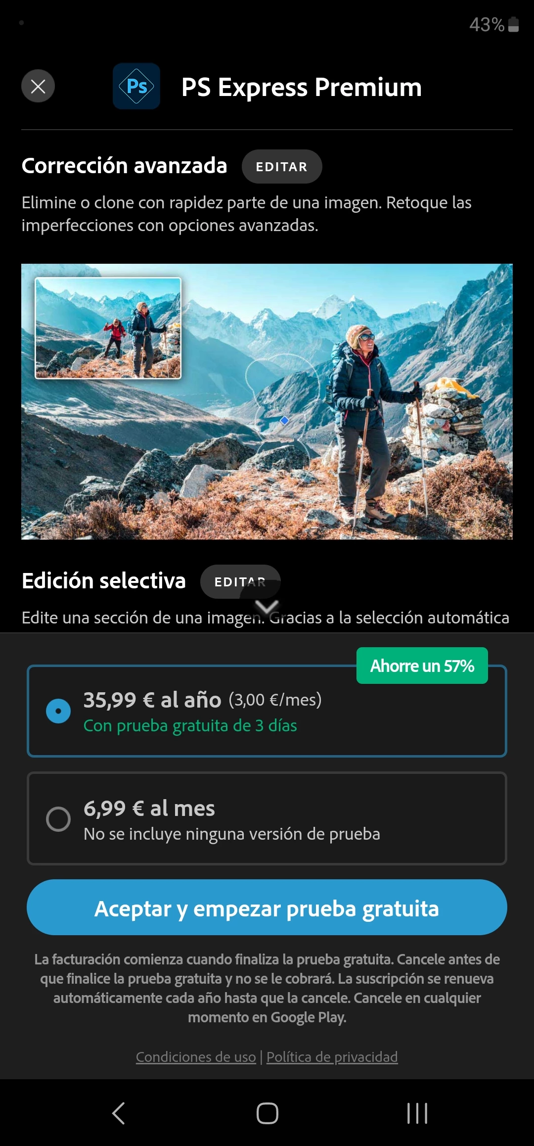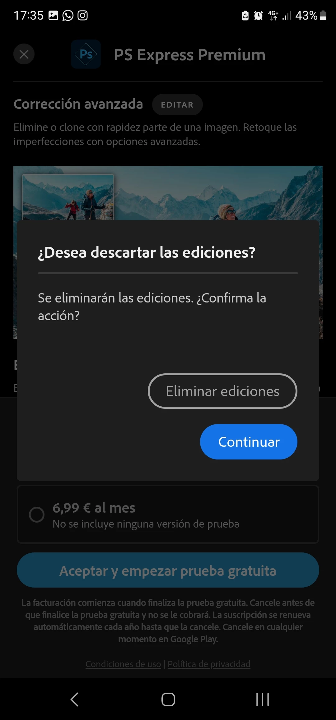 I am able to open the apps but after making a change in the edition, I cannot continue if a new function is selected or if I try to save the result because the app jumps to a new screen asking for premium subscription. When I refuse and try to come back to the Edition work, the app deletes all the work edition made.