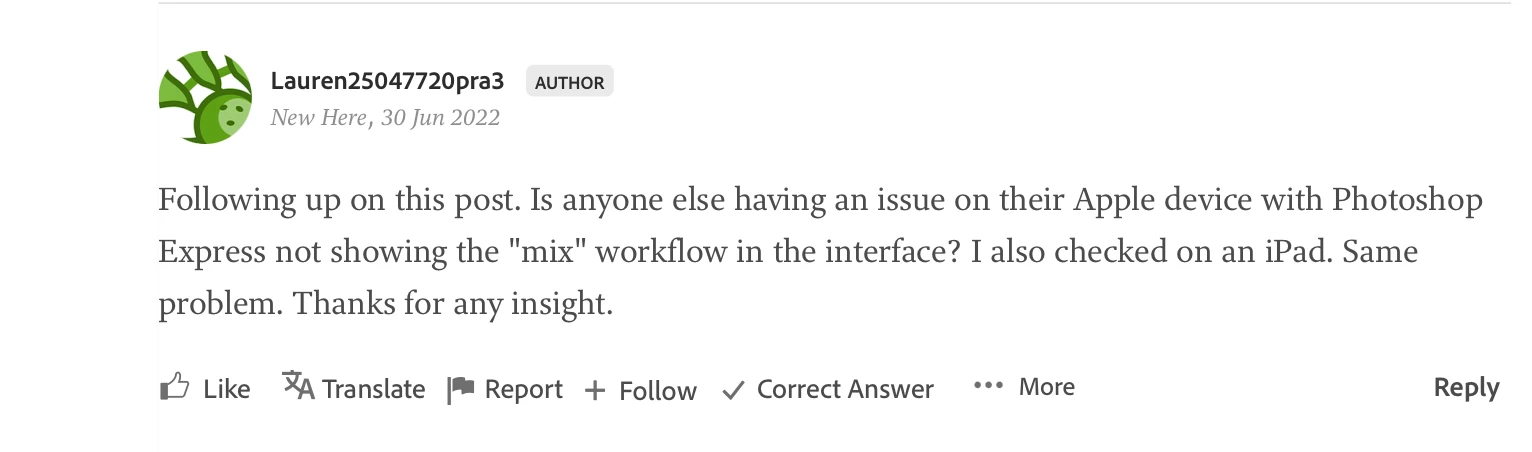I upgraded to Photoshop Express Premium (paid version) on Apple, and I still don't have the Mix workflow/icon to create composites with more than one photo. I've tried deleting and re-adding the app multiple times and have updated my IOS. Does anyone know why I could be missing this feature and how to resolve it? I'd really like to mix multiple photos of mine. Thanks so much.