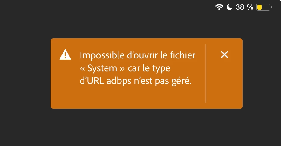 Si ça peut vous aider, quand j'ouvre à partir de la créative cloud, il y a un message d'erreur qui apparaît. Je vous l'ai mis dans les fichiers à joindre.