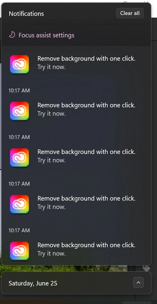 I keep getting a notification about removing the background of an image with one click over and over and over again on both my laptop & desktop. Super annoying. Please make it stop. I'm attaching a screenshot.