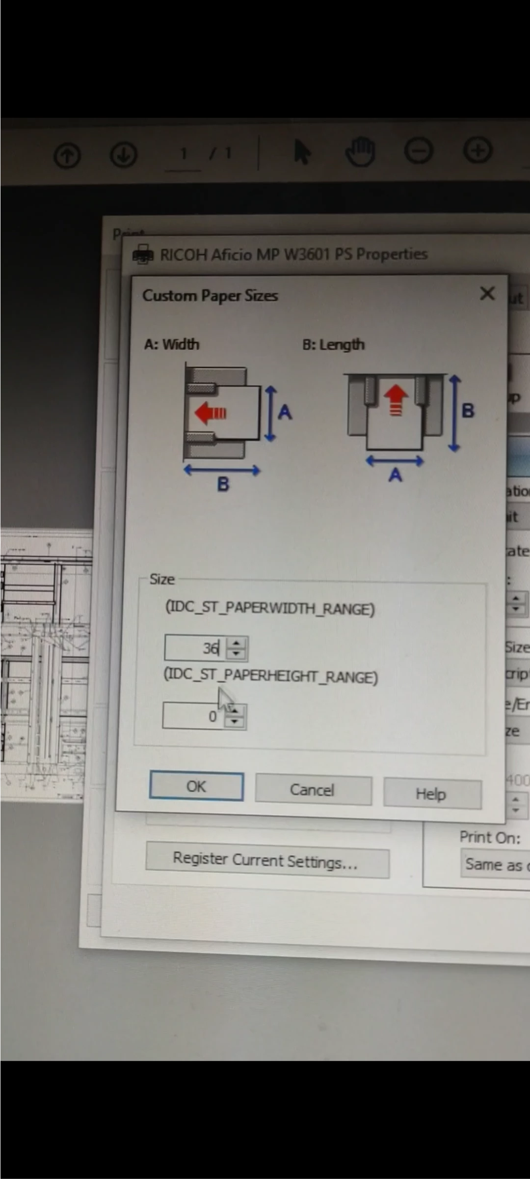 We are trying to print 36" wide x 120" long "blueprint" on a Ricoh W3601 wide format printer, and the 36 disappears in the first box when we start to type in the 120 in the second box. WIN 10 64 bit PC. Customer says they use to be able to do it without issues.