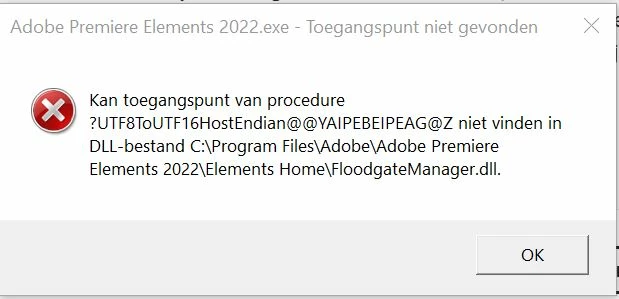 Dear Mrs. Mr. I have start problems with my Adobe Premiere Elements 2022. First it took a long time start. Then the start kept on hanging 'Laden ImporterQuickTime.prm'. Then I tried install a new and this gave the following signal: Can't find C:Program Files\Adobe\Adobe Premiere Elements Home\FloodgateManager.dll. What can I do? Kind regards, Ronald