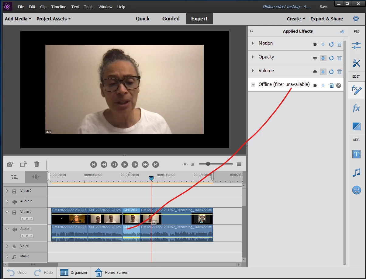 - I didn't find anything specifically germane, but one post mentioned something about that issue, and noted that the user reapplied an effect, but when they closed the project and reopened it, the effect was Offline again.