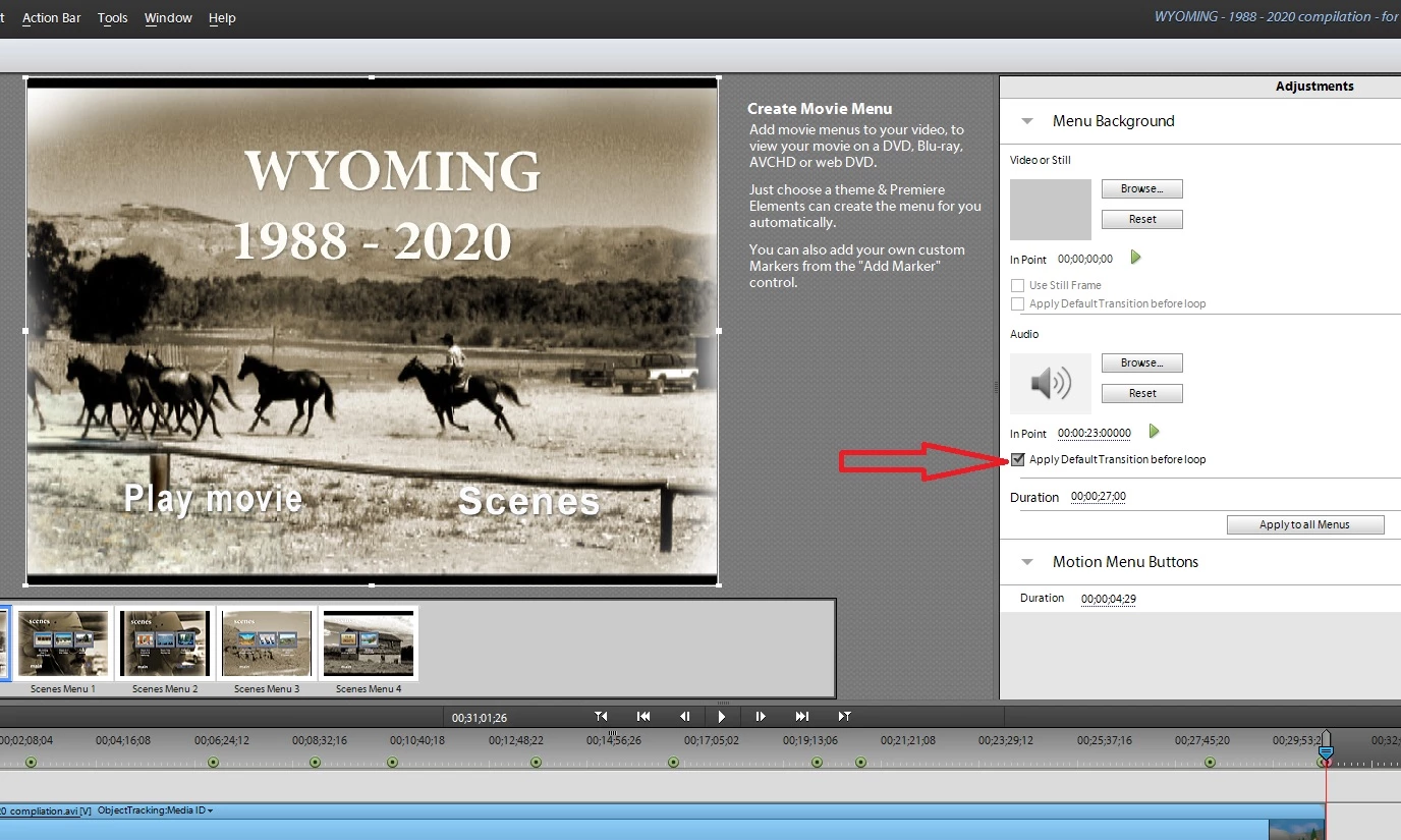 When editing my disc menu, I know how to add an audio clip and how to set the starting and ending points (“in point” & “duration”), but I do NOT know how to "Apply Default Transition Before Loop" for the audio.