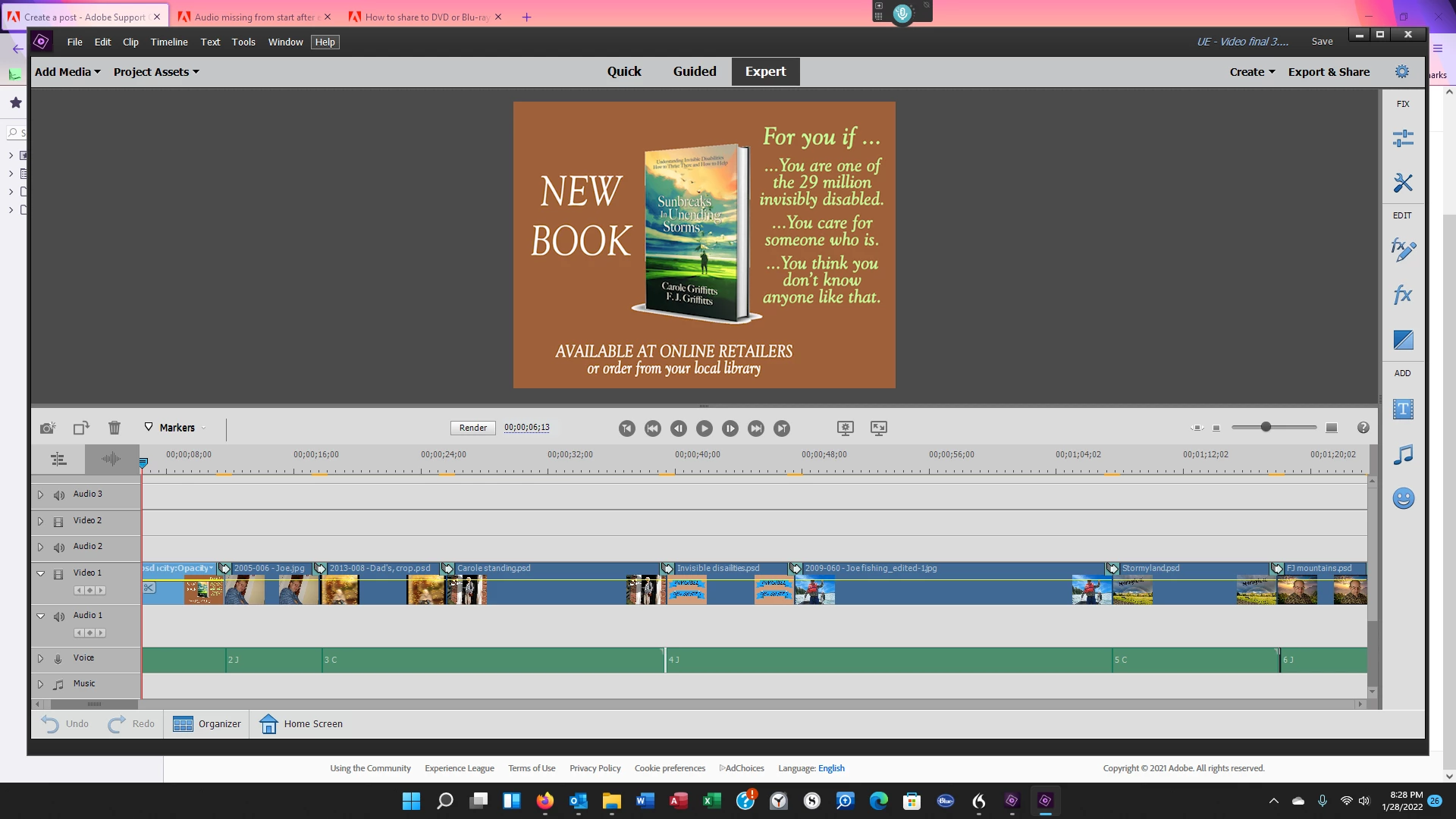 I used Export & Share > Device > Computer to export my video (MP4) (single images & wav files). Images look great, but NO audio can be heard. In Premier, sound is fine. I don't know what to check.