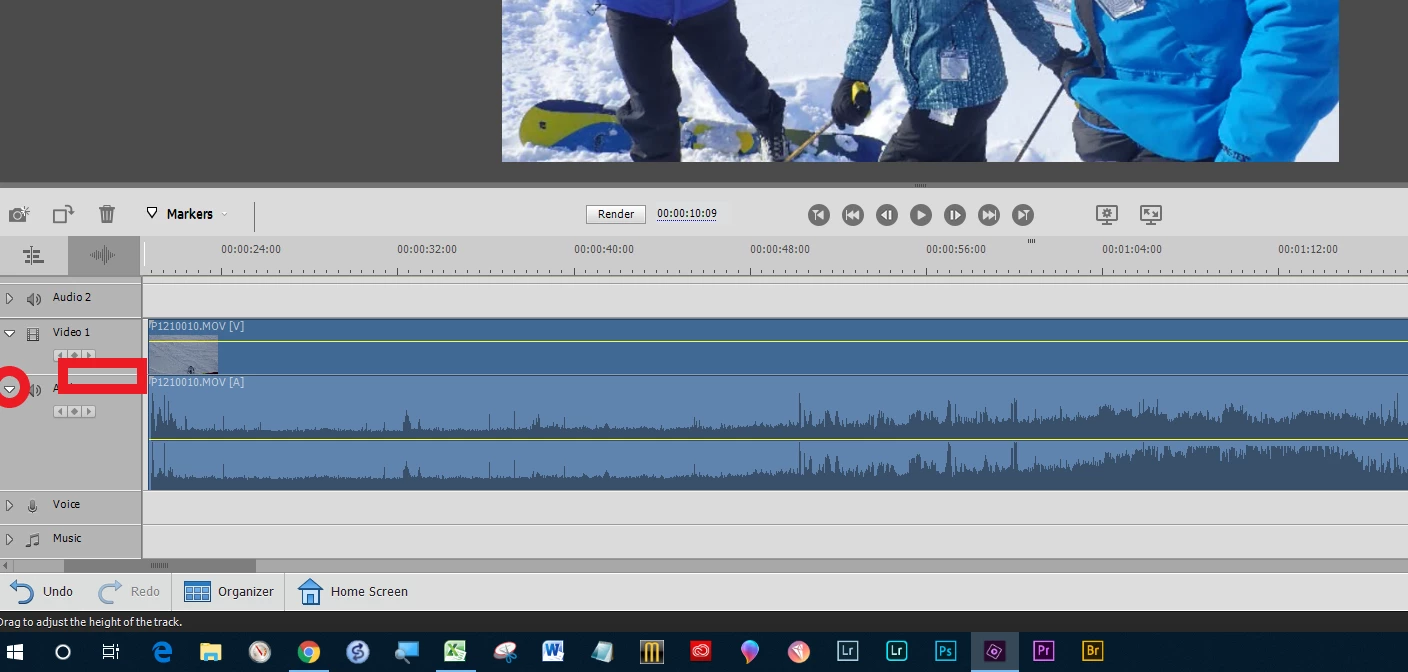 Click the little arrow inside the red circle to expand the audio line. Then grab the line inside the rectangle with your mouse and drag the line up.