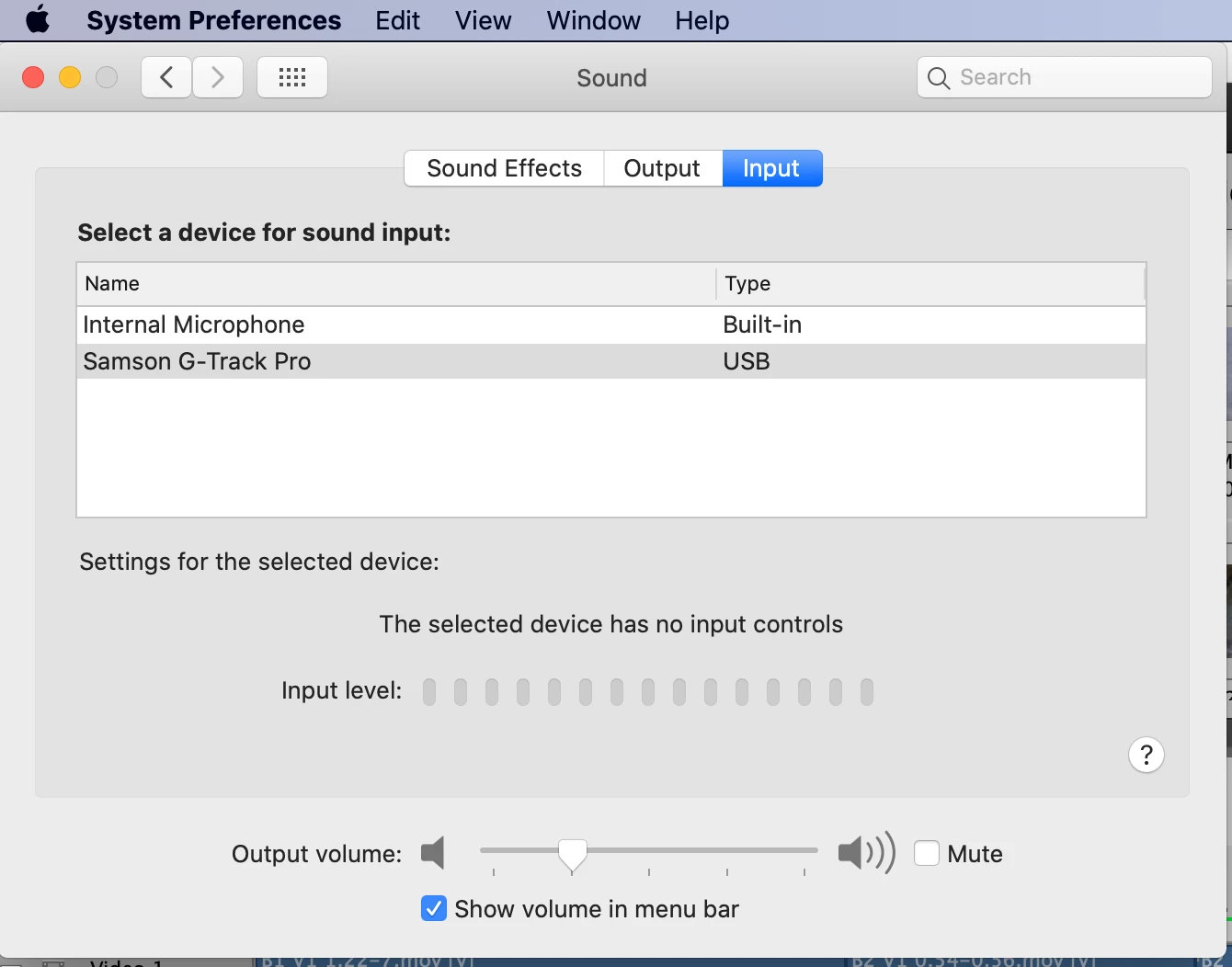 - Apple > System Preferences > Sound > Input > [Select a device for sound input: Samson G-Track Pro];