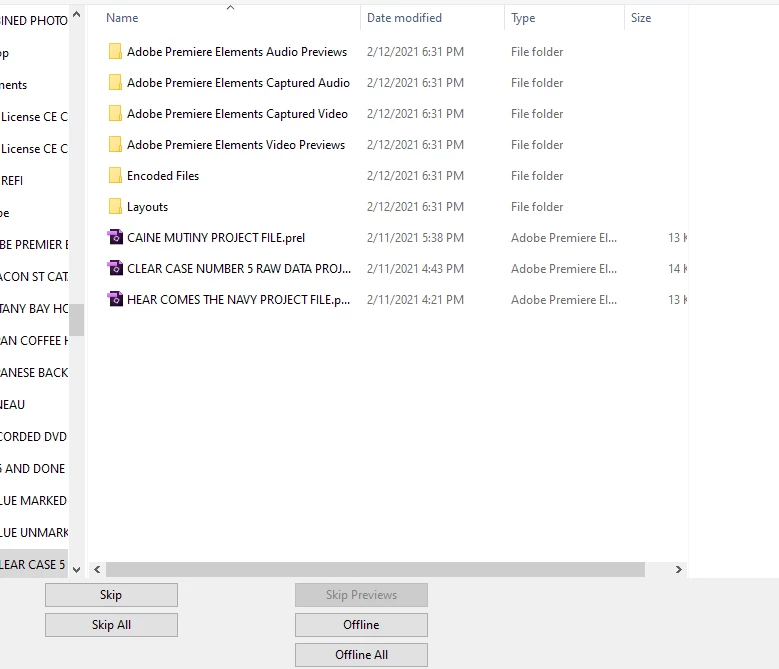 i am trying to load a previously created project file for export in elements 2021. i have had no problems downloading it before but now i get a box saying file is not supported codec not loaded. on the box to select a file are buttons "skip", "skip all", "offline" and "offline all". these are files ripped from a dvd I recorded off the tv and all the others i have done worked fine. and these worked before. any idea what may have happened? Thanks