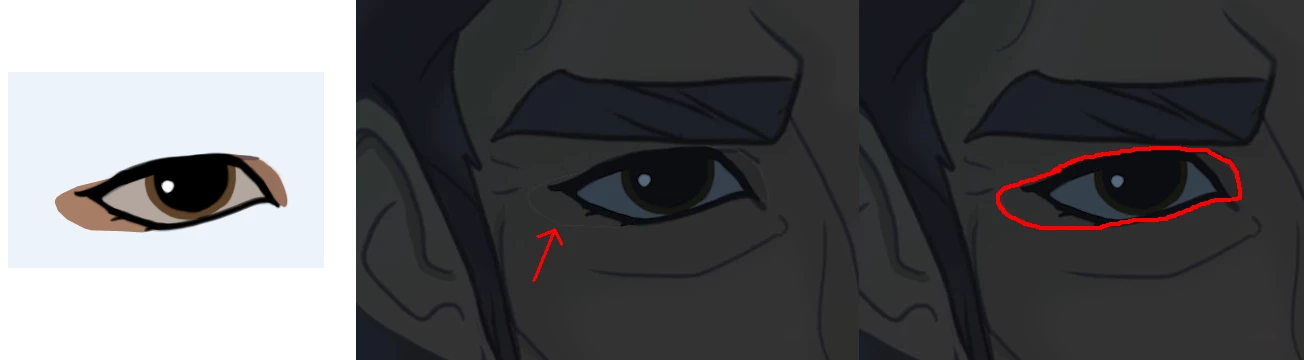 Aquí pongo un ejemplo: He dibujado una cara completa con los ojos mirando hacia abajo, y en la capa/canal de arriba he colocado otra imagen en la que sólo he dibujado los ojos mirando hacia arriba. Se puede ver que toda la zona del ojo (incluyendo parte del color de sombra de la piel) ha quedado contorneada.