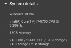 I have a Dell XPS 8930 desktop, with a Intel (R) Core(TM i7-8700CPU@3.20GHz, 16GB Memory. I am using a 5TB Seagate external hard drive to store the files on.