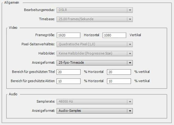 Aufgenommen wurde mit Canon DSLRs in FullHD mit 25B/s im MOV-Format sowie mit Mono/Stereo-Mikrofonen und Mischer-Exports im MP3-Format (48kHz, 320Mbit/s). Die Projekteinstellungen habe ich entsprechend gewählt: