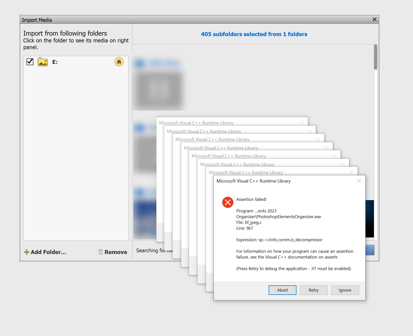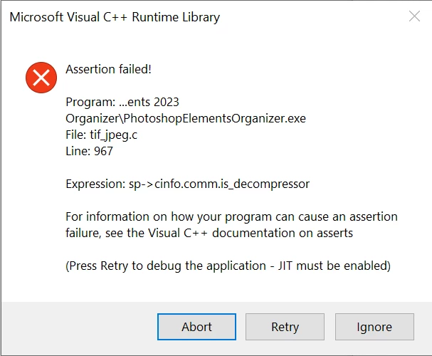 Just installed Premiere Elements 2023 and decided to give the organizer a quick trial. I pointed it at some folders and it immediately threw many assertion failures. Tried other folders and the same assertions pop up -- looks like it's encountering something it can't hanlde but is not doing so very gracefully. Screen shots below. The latest cpp redist I've got installed is (I've got earlier ones as well):