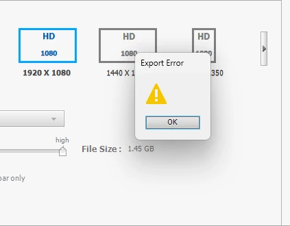If I try to export my current project as 1920x1080 as MP4 with a estimated target size of 1,45GB I get an empty error message: