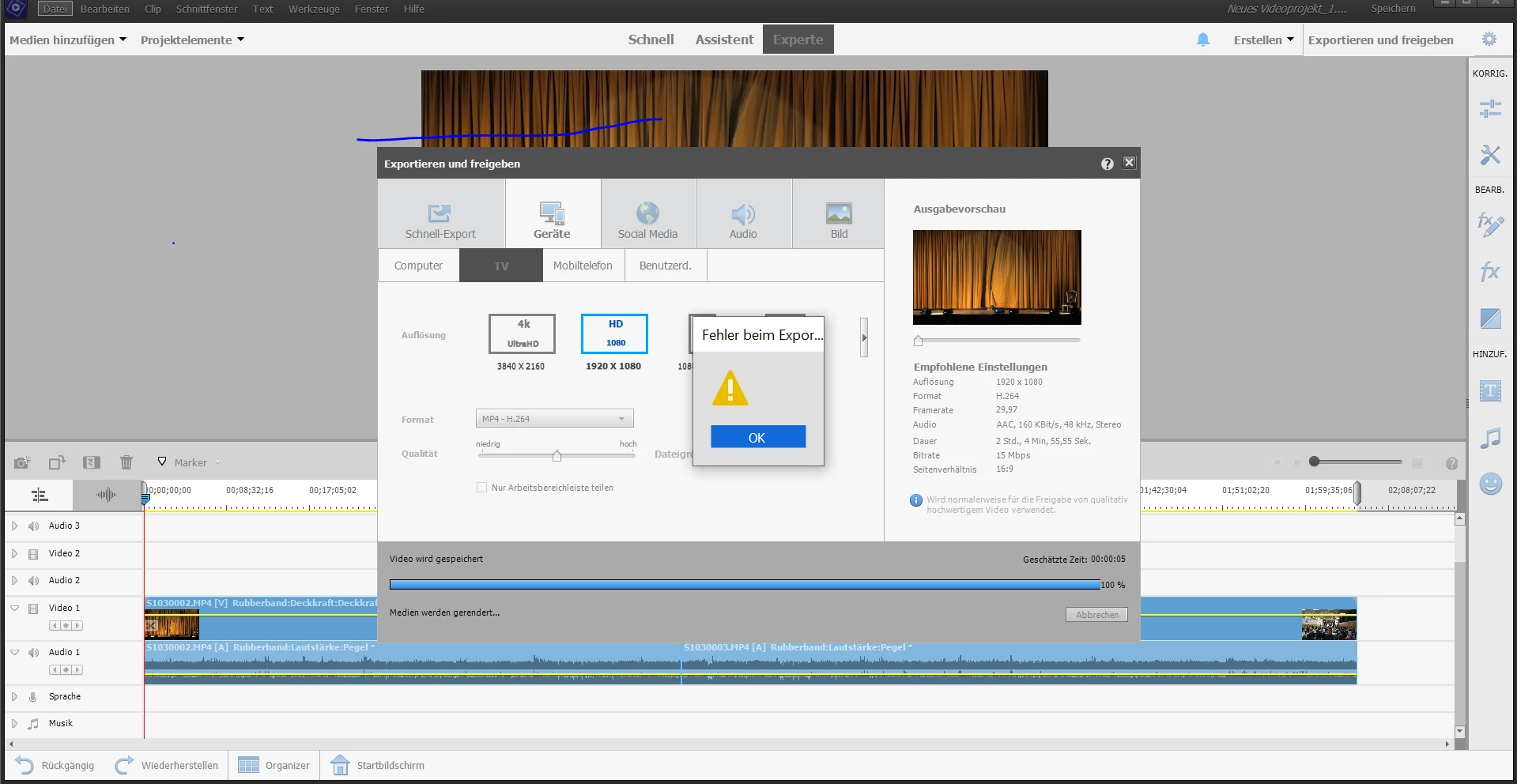 Der Export läuft und nach 100% kommt immer diese Meldung (s. Bild).