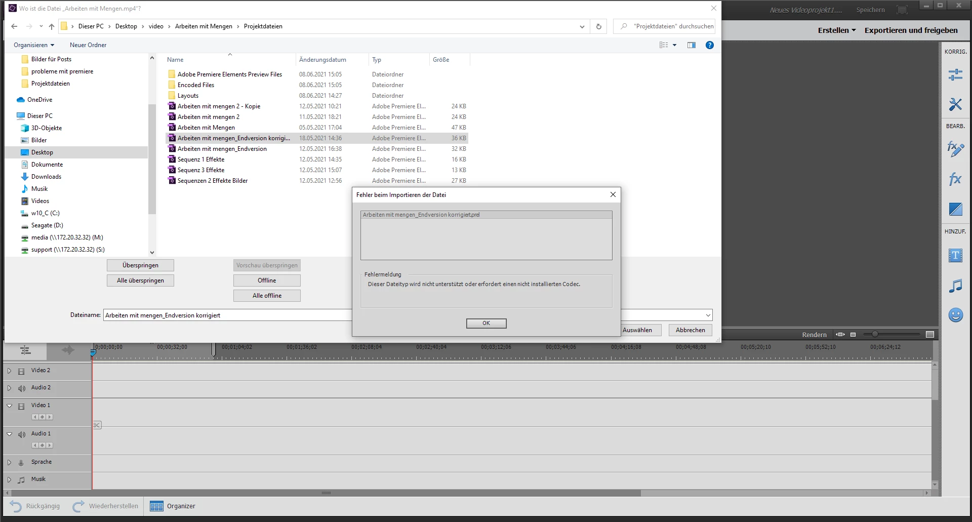 Hallo, ich habe ein Problem mit dem Program adobe premiere elements 15, das ohne Abonnement läuft. Die Lizenz ist für 2 PCs gültig, das Programm funktioniert aber nur auf einem PC und auf dem anderen nicht. Ich bekomme folgende Fehlermeldung: Fehler beim importieren der Datei, Dieser Dateityp wir nicht unterstützt oder erfordert einen nicht installiereten Codec. Wie kann man diesen Fehler beheben? danke