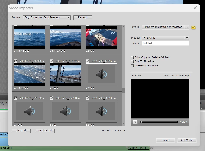 Everything was perfect until a few days ago when I added a mp4 clip (20240201_134459.mp4) and only the audio was added. When viewed in VLC, Media Player and Clipchamp all is OK. This clip is the third of 4 taken on 01 February; the first two are getting across OK - all clips hereafter also fail.