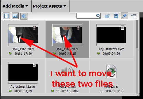 I tried once before to get an answer to this without success so I'm trying again.  I'm trying to move the files that came from the camera.  In my prior attempt to get this question answered someone said to use the the Project Assets box.  If this is correct I can't figure out how.