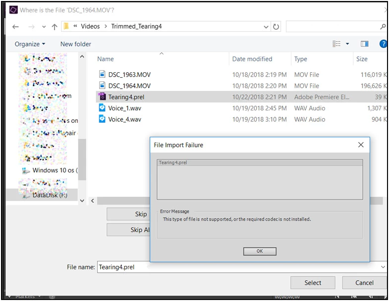It moved the files (more than the media files but that's OK). The screen capture below is of the new folder -- the one I pointed it to and which seemed to work.  But, when I try to reload the video I get this screen that has options Skip, Skip all, Offline, Offline All.  Clicking these I get the red/black screen with Chinese or Japanese writing.  Then if I try to load the Tearing4.prel file I get the "File Import Failure" message.  AND, when I try to load earlier versions of this same video it now goes to this same folder that doesn't work.