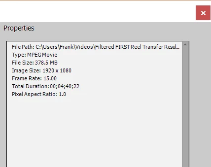 Premiere Elements gives me the original properties as 1920 x 1080; see the screenshot below.  When I look at the original and new video on my laptop screen in Premiere Elements, they "look" the same - but I guess I should hook up my laptop to a relatively large HD TV and play each with a standard video player to see if they still look the same.  If they do, I imagine it was because the original video comes from a 50 year old Super 8mm film whose quality is poor by today's standards to begin with.  I've attached a 1920 x 1080 screenshot from Premiere Elements of the first frame in the video to show you what the original's quality looks like.  Thanks for your interest in this subject.