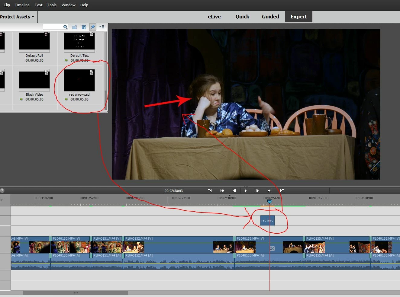 You can also make a file in Photoshop with a clear background and an arrow in it.  Put it in your Premier Elements project on a track above you video line.  You can move it around, rotate it, enlarge it, shrink it, etc with the Motion Tools in the Applied Effects panel.