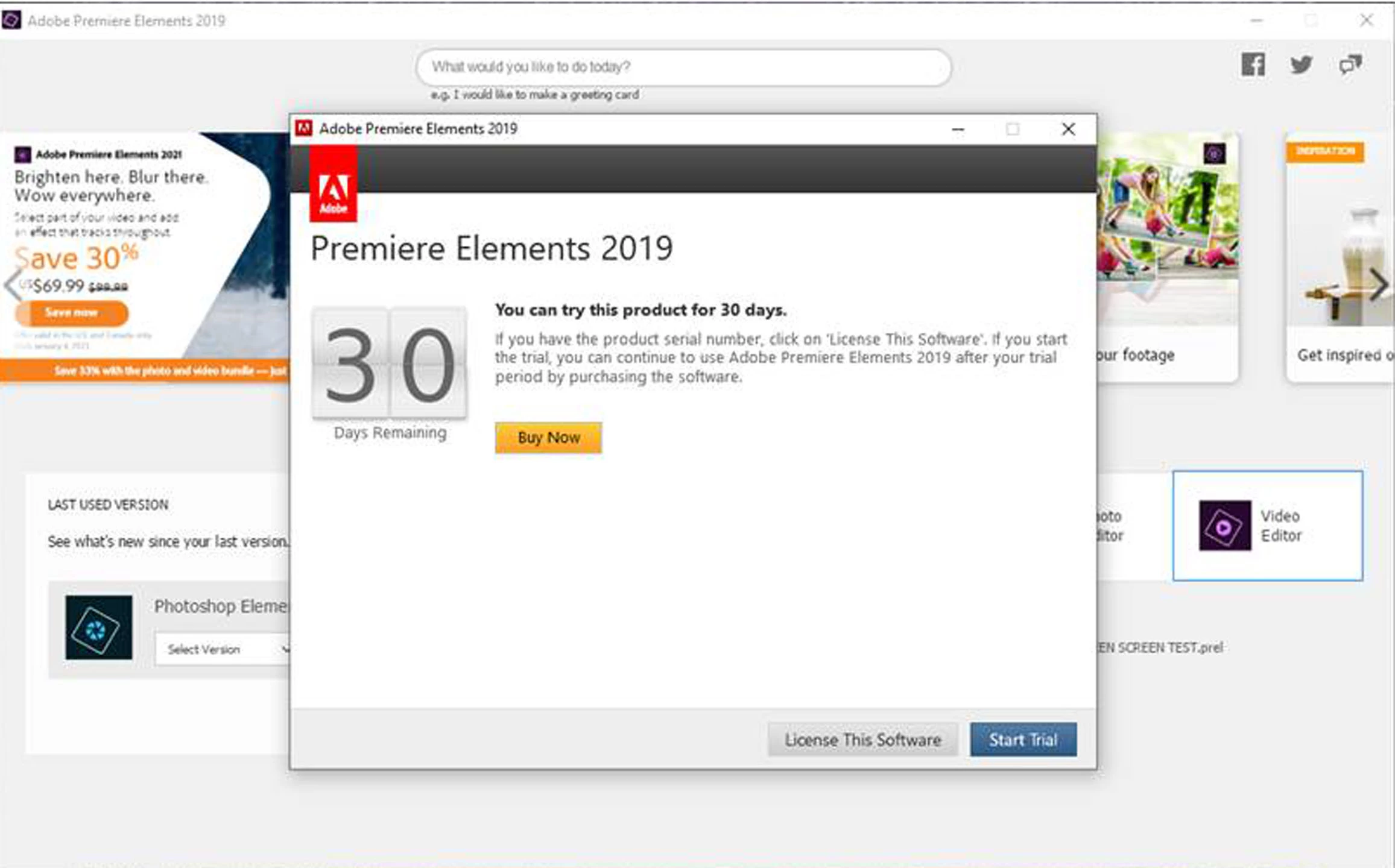 A year or so ago I bought Adobe Premiere Elements 2019, installed it and it worked find. Then a few months ago I starged getting green stripes across the preview screen. I updated all my drivers and that did nothing. Finally I uninstalled Premiere Elements and tried to re-install with the disk I'd bought. That didn't work so I downloaded it to install it and got a screen that says I have the 30 day free trial or I can buy it right now. I uninstalled that since I'd already paid for it and tried installing with the disk again. It installed fine but then said I had to sign in and again presented the pop-up that I could start a 30 day free trial and then purchase it or purchase it right now. Since I already purchased it, why is it giving me this false message? How do I use my paid for and installed Adobe Premiere Elements 2019 without this happening? Attached is a screen shot of the message I keep getting.
