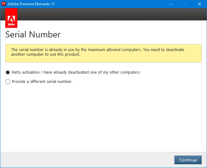 I activated premiere elements 13 back in 2014 and it has been working fine for years. Recently though I switched windows and changed to a static IP adres (I have no idea if these things have any effect). On my new windows I tried doing a project in Premiere Elements and it said I'm on a trial version so I chose the option to activate my license. I got a message saying that I need to deactivate my license on my previous computer. The problem is I am still on the same PC and I am logged onto the same account from back in 2014. So I would like to know: