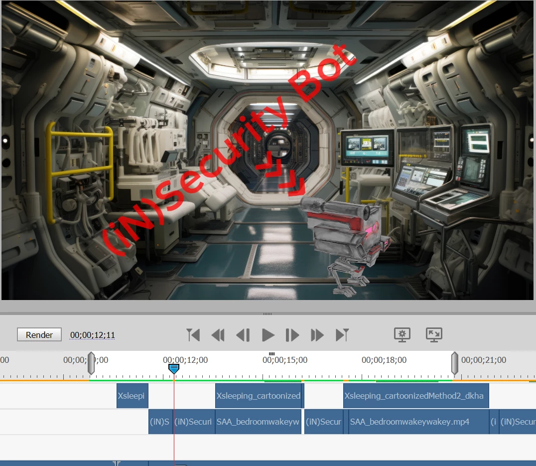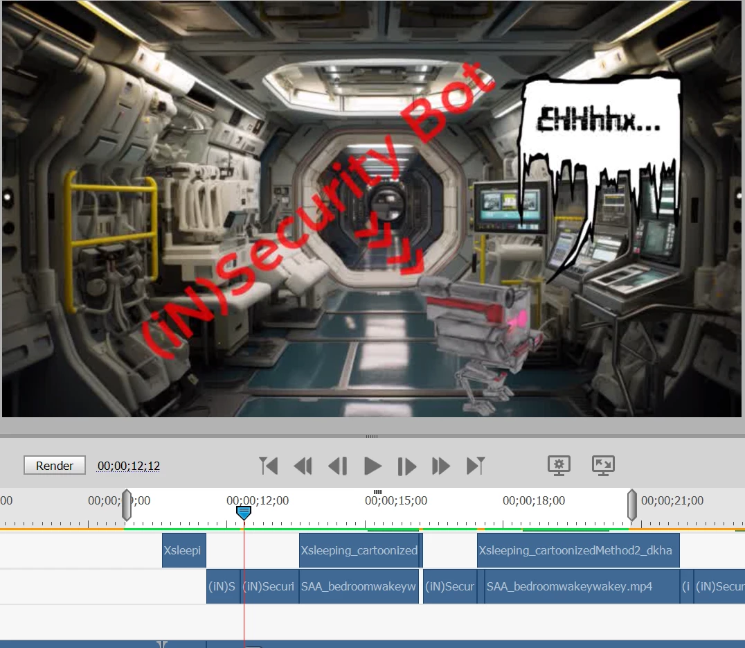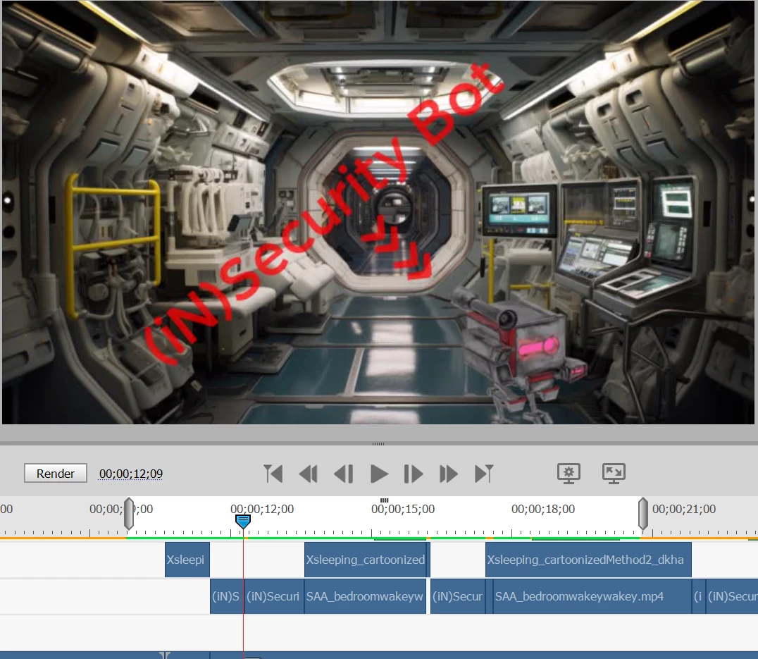 ** Upon switching to a different overlying robot image (also unscaled, not animated but with strobe light effect added), i.e. the duration of the first robot image ends and the new robot image picks up on the same track immediately thereafter) the backdrop momentarily (2 frames) returns to its clear, correct, native size (once again perfectly fitting the 1920x1080 project size) but upon framing forward it again scales up vertically ever so slightly (visually only -- settings remain at 100% scale) making the background fuzzy again.