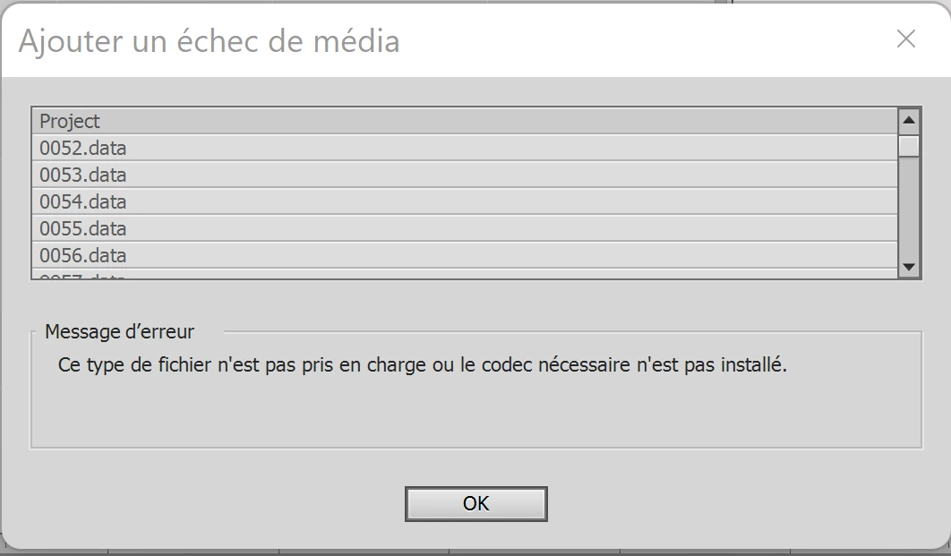 So I have bought Adobe Premiere Elements 2021 running on Windows 11. But when I select the iMovie project folder and I click on Import, I get the message below which means "This file type is not regognized or the required codec is not installed."