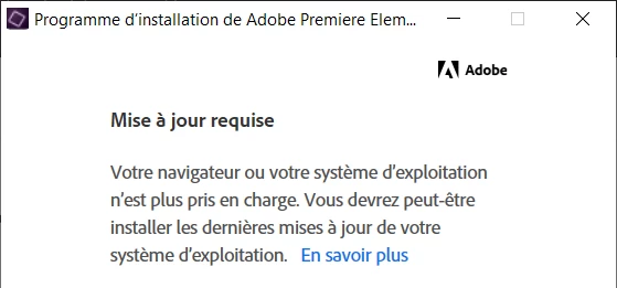 Je viens de réinstaller mon ordinateur avec la dernière version de Windows 10 à ce jour (21H1). Je viens de télécharger via mon compte ADOBE le fichier d'installation : "PremiereElements_2019_LS31_win64". Au moment de l'installation j'ai le message suivant : "Mise à jour requise. Votre navigateur ou votre système d’exploitation n’est plus pris en charge. Vous devrez peut-être installer les dernières mises à jour de votre système d’exploitation." Ce que je ne comprend pas car cette application fonctionnée sur mon PC avant réinstallation de l'OS Windows 10. J'ai essayé quelques réglages, dans les config du système en désactivant tout les services et en désactivant tout au niveau du Démarrage, donc aucune application ne peut poser de problème pour l'installation. Je soupsonne ADOBE de me faire croire que la version 17 n'est plus compatible mais j'en doute totalement... Avez-vous une astuce pour réinstaller cette version, sans passer par un abonnement?