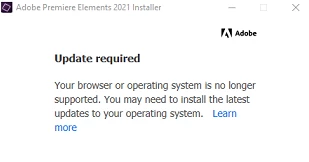 I have a computer that's on Windows 10 21H2 trying to install Adobe Premiere Elements 2021 and Adobe Photoshop Elements 2021 and I get the below error. I have other people in my office that installed the upgrade on Windows 10 1909 and recently upgraded to 21H2 and are still able to launch this version (have not tested installing though). Is this version of Premiere/Photoshop not compatible with Windows 10 21H2? Also just an FYI, I do not have Creative Cloud installed either (not sure if this is required or the root cause of my issue)