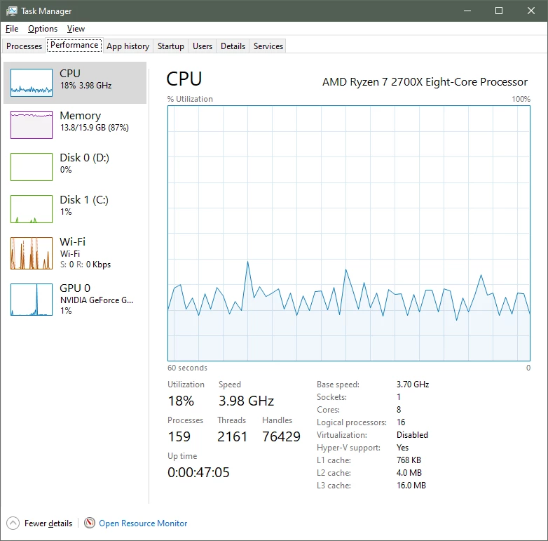 I am running a AMD Ryzen 7 2700X Eight-Core Processor 3.7 GHz and 16 GB of RAM. I was almost about to buy 32 GB of RAM to solve but am trouble shooting now and reinstalling.