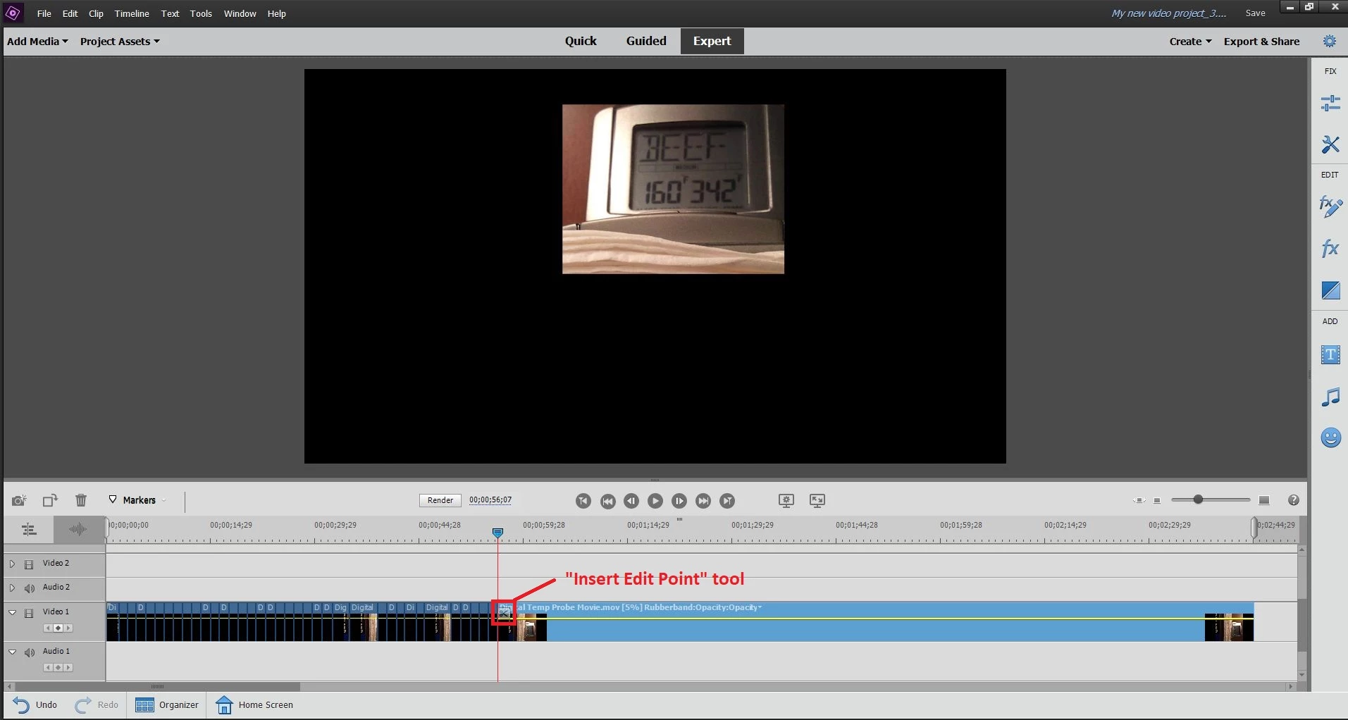 I am using Adobe Premiere Elements 2022. I shot a timelapse video on my iPad of my digital meat thermometer that I was using to measure my oven temperature to see how well the oven maintained temperature. The iPad took a picture every 30 seconds. My end goal is to make an Excel spreadsheet with times in Column A and temperatures in column B and then make a chart to graphically show the temperature of the oven over time. I noticed that sometimes the temperature did not change for two or more captures but it would be hard to know exactly how many without quantifying the time between captures in the video so I opened the video with Premiere Elements 2022 and used Timestretch to slow it down so the captures occurred about every 2 or 3 seconds. Every time I see the reading change on the temperature probe display I stop the playback and use the "Insert Edit Point" tool on the timeline (see red box on screenshot) to insert an Edit Point. I do this because sometimes the temperature does not change from one iPad capture to the next so if the Edit Points in Premiere Elements end up being twice as far apart as the average, I will know the temperature remains the same for two or more captures. The problem with this is that I have to stop the video so I can click the "Insert Edit Point" tool every time I want to add an Edit Point. If Premiere Elements had a keyboard shortcut for "Insert Edit Point" I could just press that key (or key combination) every time the temperature changed and would not have to stop the playback. But I cannot see that function in any of the documentation I have found on the Internet. So, my question is, is there a keyboard shrotcut for "Insert Edit Point" and if not, is there a way to create one in Premiere Elements 2022?