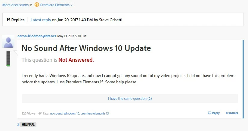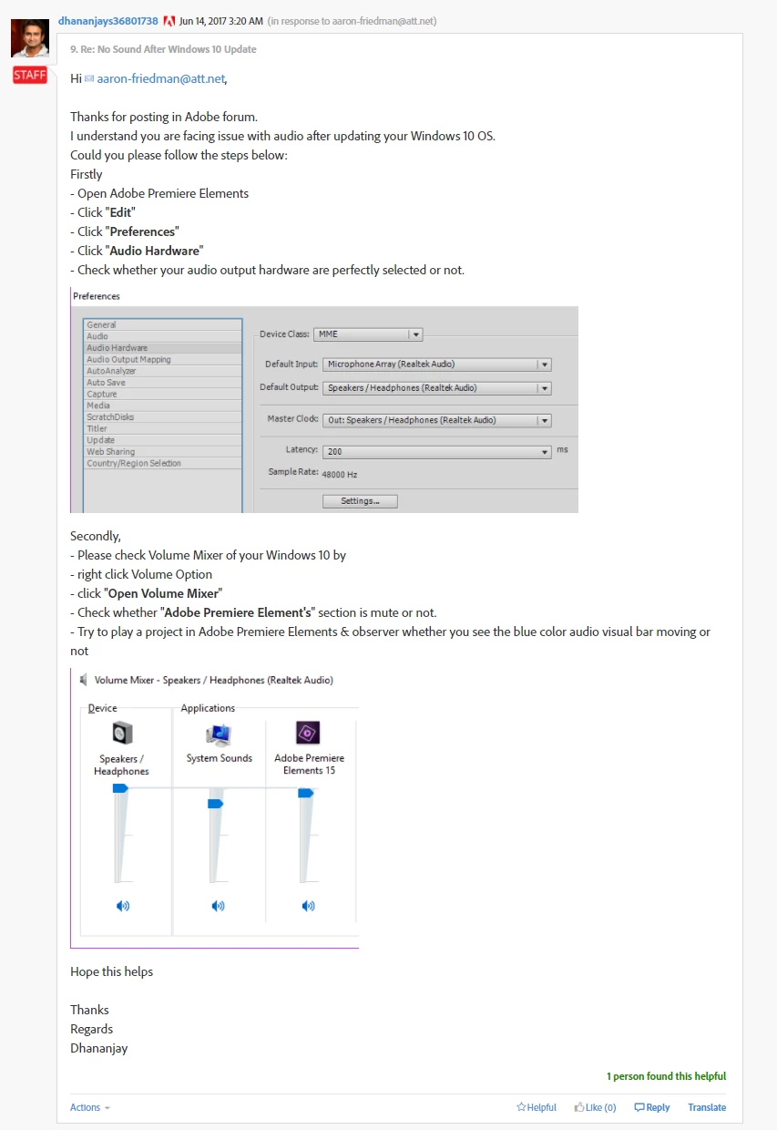 I recently had a Windows 10 update, and now I cannot get any sound out of my video projects. I did not have this problem before the updates. I use Premiere Elements 15. Some help please.