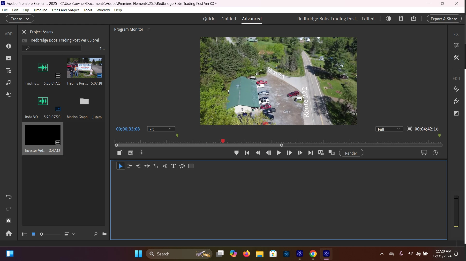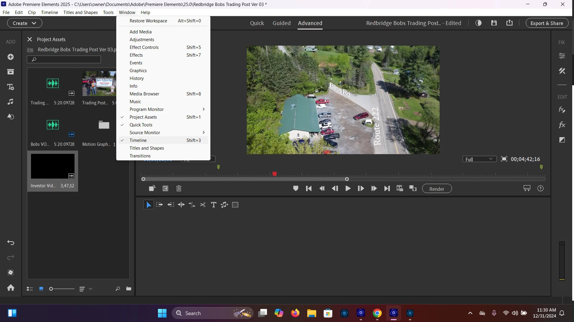 So when I work in guided view in the new Adobe Premier Elements 2025, the timeline is visible but when I switch to Advanced mode the time line window with my sequenced clips is not there. See attached pic. This is even when I look at visisble windows under the "window dropdown" tab. The Timeline window is checkmarked. See pic 02. Some important info I am running a seperate moniter inwhich I detach the "program moniter" and slide it over and I watch full screen.