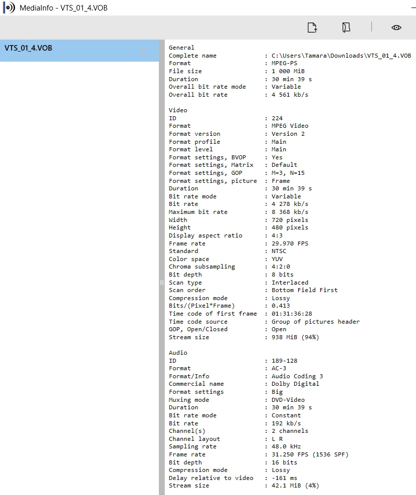 I've attached a snapshot of the MediaInfo details from my VOB video in case that helps.
