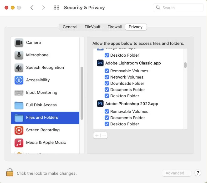 "you may have to go into Preferences -> Security & Privacy -> Privacy -> Files and Folders - then add Lightroom Classic to the Files and Folders giving it the permissions shown."