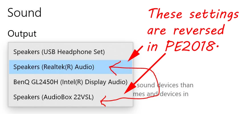 This works fine for all applicatons on my PC except for Premier Elements 2018, which reverses the speaker output choices. That is, in order to get the sound output to channel to my audio interface, I must select the default PC speakers (Realtech Audio). If the setting is set to the audio interface (AudioBox 22VSA) setting, the sound will come out of my default PC speakers. So I must change the speaker setting to be the internal "Realtech Audio" setting that will (strangely) send the audio output to the desired external audio interface instead.
