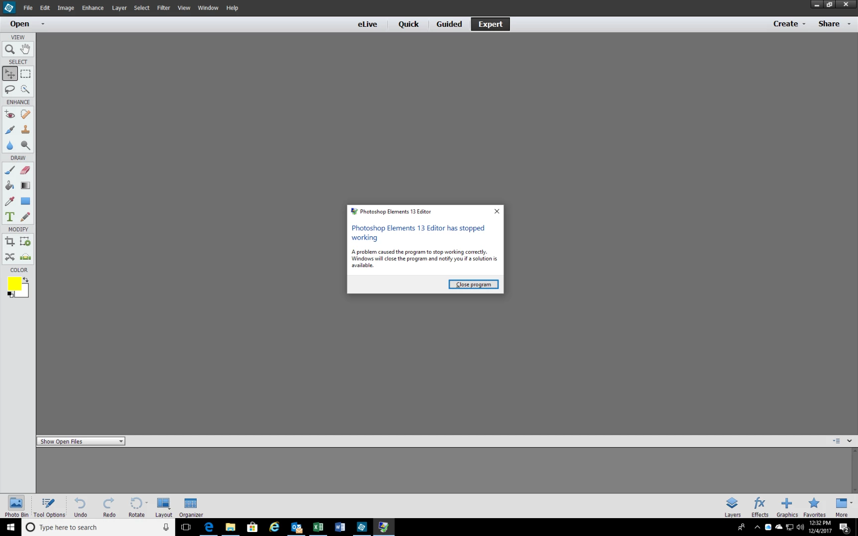 Premier elements and Photoshop 13 no longer work. When I open the photoshop editor I get the following message that it stopped working after I open it consistently. I have been successfully using the editor with Windows 10 for over a year. This seemed to occur after a recent Windows 10 automatic update/fix was installed overnight. My Elements/Photoshop license came with my Dell 8700 system, so I do not have CDs to reinstall. Help?