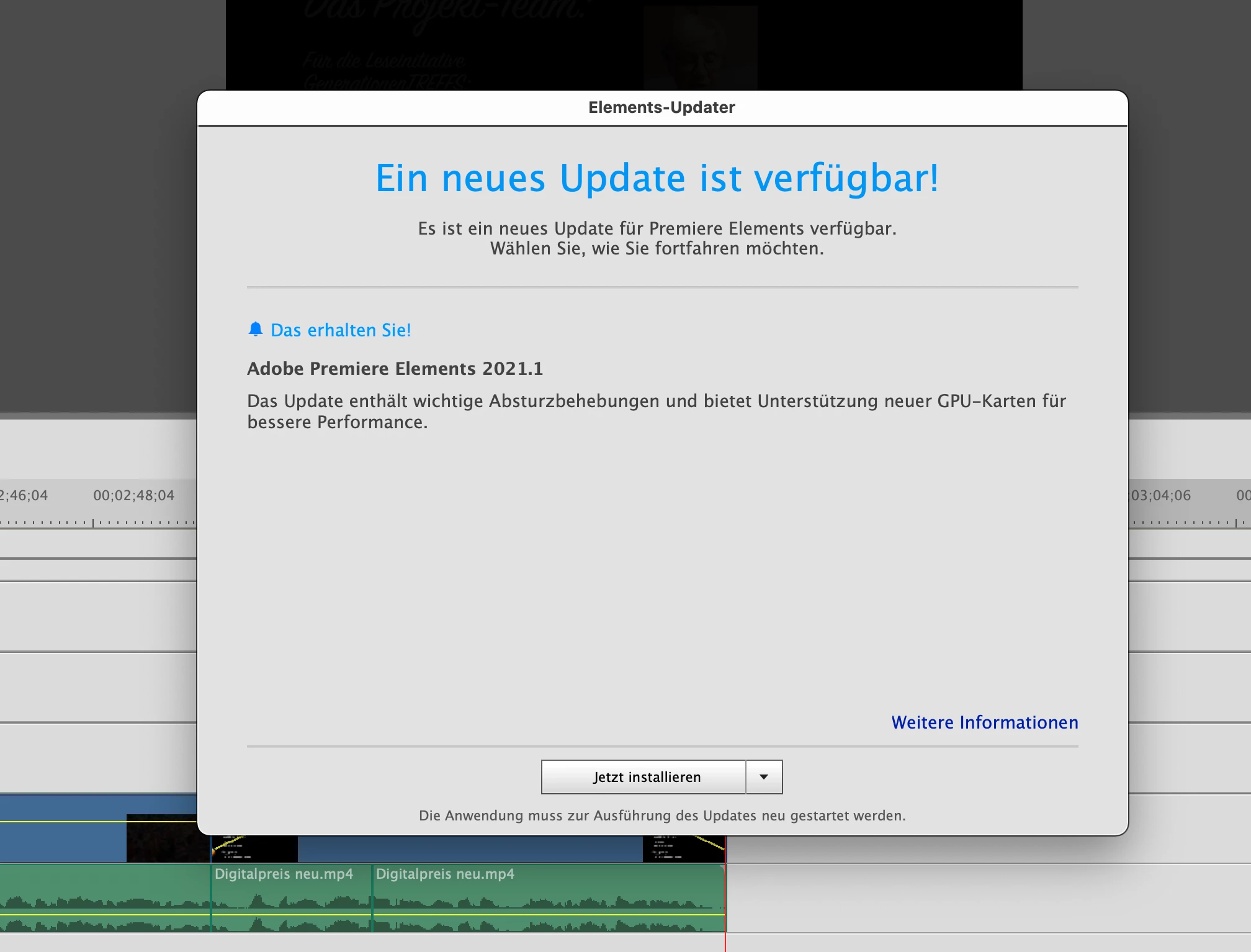 For a couple of days I am getting a message upon opening Premiere Elements Editor that a new Update 2021.1 is available (see screenshot below). And when I try to do so, I am informed that there is no App to open URL "auphd://update? ..." and that the Update-Manager could not be started (see second screenshot). Then the programme freezes. I can only get out of this by entering control + esc, which is enervating after a while.